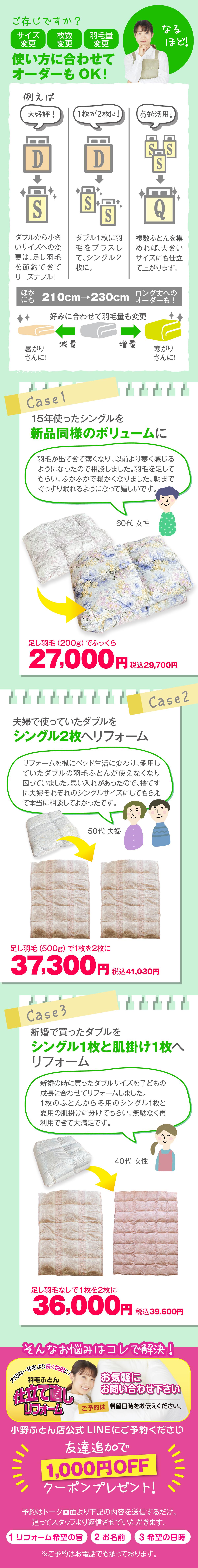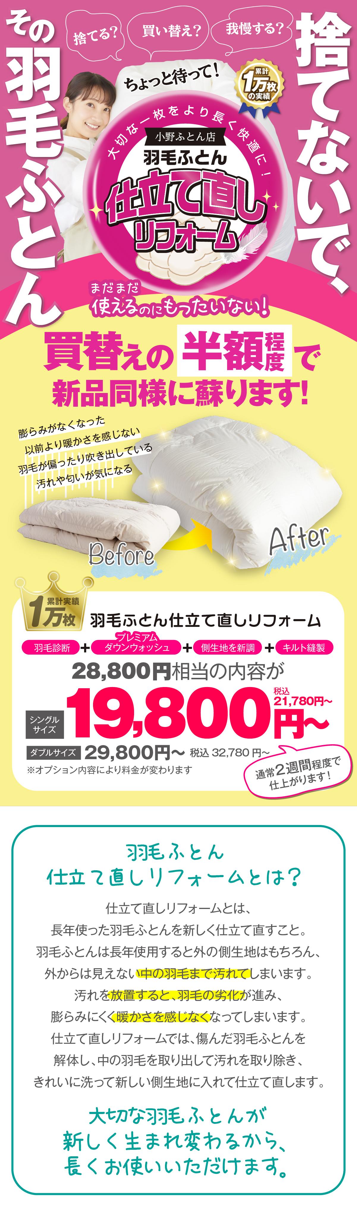 羽毛ふとんをリフォームすると、生地は新品に。羽毛は、洗浄し残った傷んでいないものと、追加した新しいものになります。使い方にもよりますが、時々丸洗いクリーニングをすると、10年程度お使いいただけます。